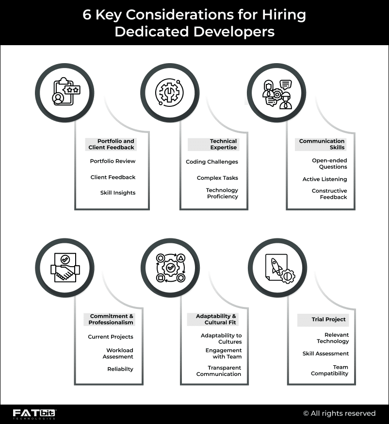 The trend of remote work has gained momentum. Today, businesses can tap into a vast pool of dedicated developers from worldwide. They can hire dedicated developers for their projects at their convenience. These key considerations will help them onboard the best individual or team of developers for their project. Explore the six key considerations for hiring dedicated developers: